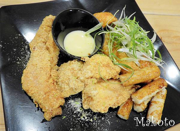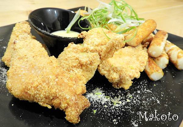 綠蔥雞將酸辣醬淋在炸雞上,酸甜帶點微辣的滋味好吸引人,上頭蔥絲味道濃郁,一同入口好過癮啊!而白底雞的起司是另附,可以自行沾取或是淋上,雞肉細嫩、咬起來順口,可以先吃看看原味,再沾沾會牽絲的濃郁起司,每塊炸雞都緊緊鎖住精華滋味,咀嚼時感覺香嫩多汁的肉品,超新鮮的且每塊都是大尺寸喔!還會附上幾塊長條炸年糕,吃起來Q彈好吃。