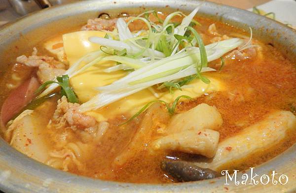 必點部隊鍋,料超豐盛CP值很高喔!微辣湯頭是泡菜雞底,襯托著每一道料的精華美味,店家豪邁加入料包括豬肉片、香菇、德國香腸、蛤蜊、蛋、片狀年糕、泡麵以及一片起司,趁熱把它攪拌融合,享受每一項食材的新鮮好滋味,體會多樣的結合,微辣間感受物超所值的滿意好味道。