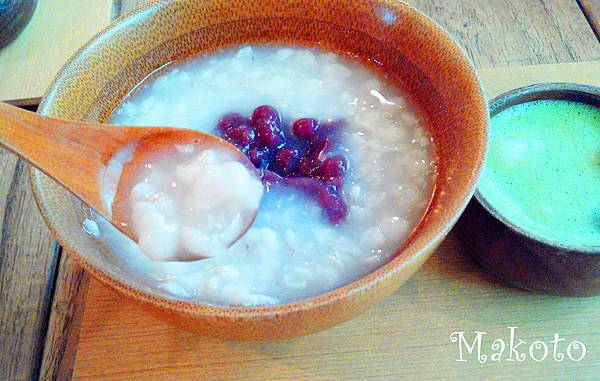 一碗紅豆薏仁甜度適中、入口滑順精心熬煮的薏仁濃稠沒有多餘豆味,和湯融為一體清涼又濃郁,和紅豆就是經典古早味絕配,甜味都從萬丹紅豆中滲出,大顆飽滿的紅豆軟嫩好吃,兩者就是最佳拍檔,直接吃就很棒;而附上的小缽裡盛裝著一保堂的白玉抹茶湯圓,三顆白玉有彈性又不黏牙,兩顆抹茶湯圓,以及抹茶,整體充滿抹茶香與濃濃茶韻,沒有讓人不悅的苦澀。